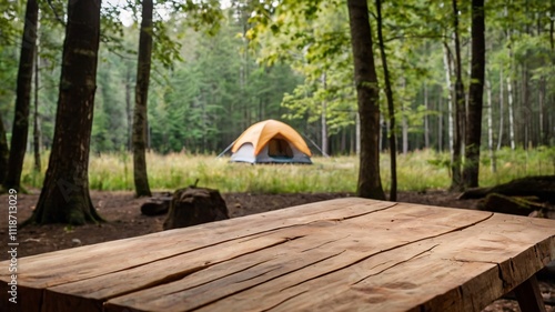 The watermark will not be included on Wall mural.: A empty wooden table in the foreground with a tent and trees in the blurred background, suggesting a