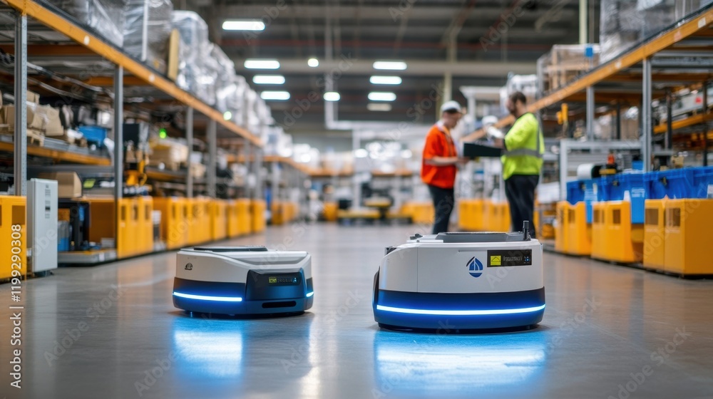The watermark will not be included on Wall mural.: A factory floor bustling with activity capturing workers collaborating with robots as they undergo a