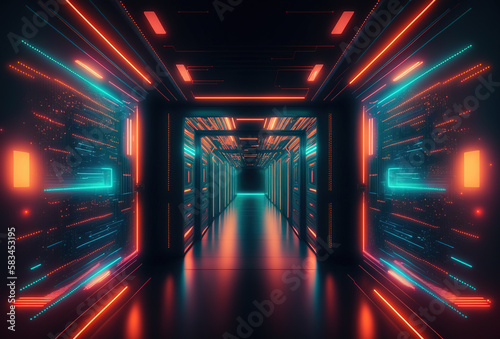 Wall mural a fantastic neon tunnel, the corridor of a spaceship. immersion in virtual reality, artificial intel