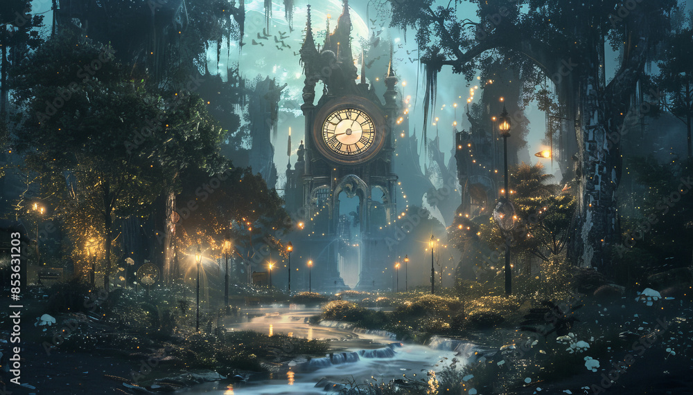 The watermark will not be included on Wall mural.: A fantasy scene with a large clock tower in the center by ai generated image