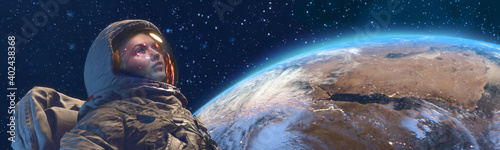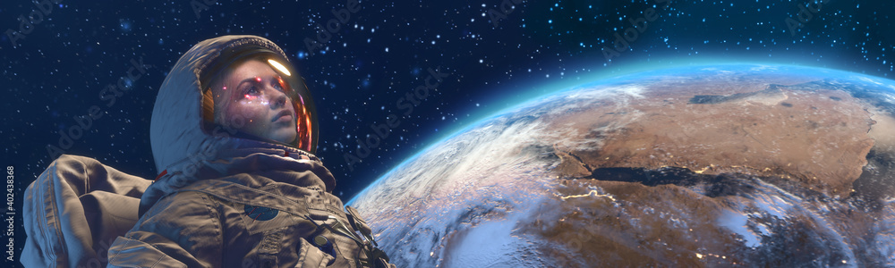 Wall mural : A female astrounaut in outer space against the earth planet on background