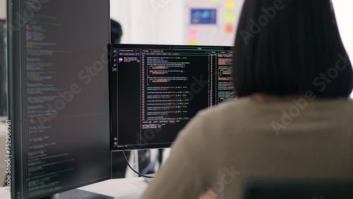 Wall mural a female developer is observed from behind, scrutinizing a complex codebase on her monitor within a  - Wall murals Wall mural a female developer is observed from behind, scrutinizing a complex codebase on her monitor within a - Wall murals