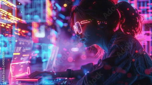 The watermark will not be included on Wall mural.: A female programmer works intensely at a futuristic computer, illuminated by vibrant neon lights and
