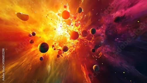 Wall mural a fiery explosion in space with planets and debris scattered across the scene - Wall murals Wall mural a fiery explosion in space with planets and debris scattered across the scene - Wall murals