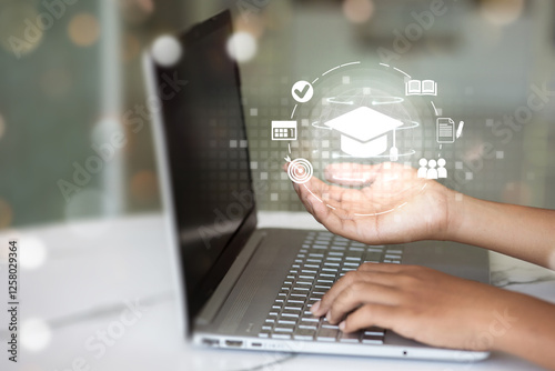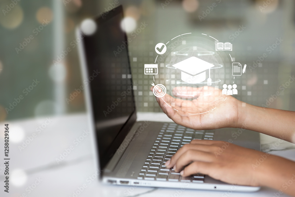 The watermark will not be included on Wall mural.: A finger touching a laptop keyboard with floating digital ui elements