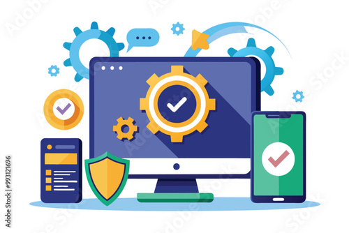 Wall mural a flat illustration displays a computer and phone undergoing security updates with gears and checkma - Wall murals Wall mural a flat illustration displays a computer and phone undergoing security updates with gears and checkma - Wall murals