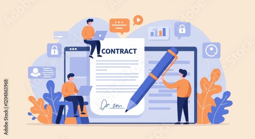 Wall mural : A flat illustration of a large digital screen displaying a contract document