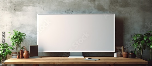 Wall mural : A flat panel display, also known as a computer monitor accessory, is positioned on top of a wooden d