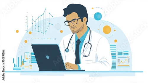 Wall mural : A focused epidemiologist analyzing data on a laptop, surrounded by charts and graphs, in a light sol