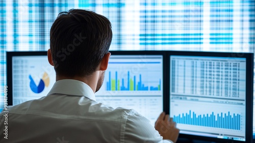 Wall mural a focused financial analyst analyzing data on a computer screen with spreadsheets and financial repo - Wall murals Wall mural a focused financial analyst analyzing data on a computer screen with spreadsheets and financial repo - Wall murals