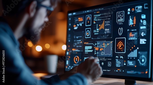 The watermark will not be included on Wall mural.: A focused individual analyzing data on a modern computer screen at night, showcasing digital insight