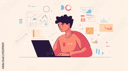 Wall mural : A focused informaticist analyzing data trends on a laptop, surrounded by charts and graphs on a ligh