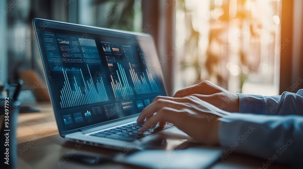 Wall mural a focused professional analyzing website traffic data on a laptop, surrounded by digital marketing m - Wall murals Wall mural a focused professional analyzing website traffic data on a laptop, surrounded by digital marketing m - Wall murals