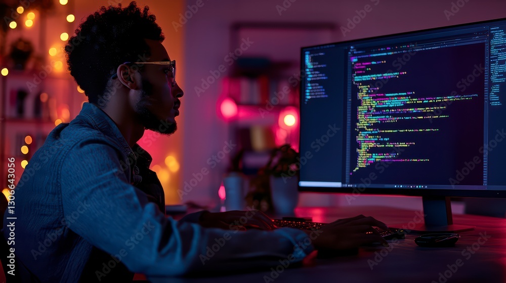 The watermark will not be included on Wall mural.: A focused programmer engrossed in his code, lit by the soft glow of the screen, working diligently i