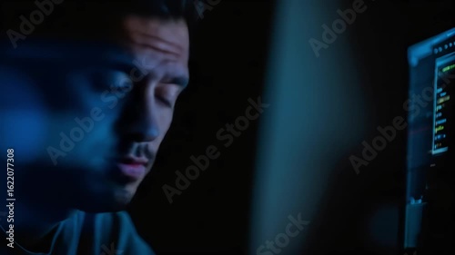 Wall mural a focused programmer works late at night, his intense face illuminated by glowing lines of code on h