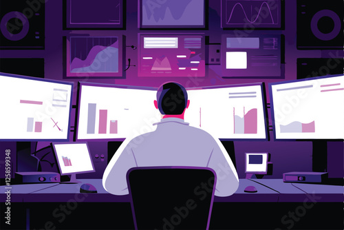 The watermark will not be included on Wall mural.: A focused researcher meticulously analyzes data on multiple computer screens in a modern, well-equip