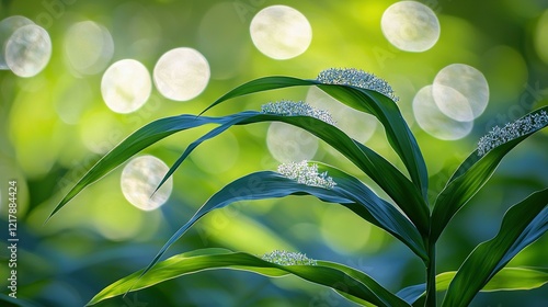 The watermark will not be included on Wall mural.: A focused shot of a green plant with a hazy backdrop of sunlight and a hazy front view of foliage