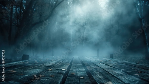 Wall mural a foggy forest with a wooden bridge in the middle. the bridge is surrounded by trees and the fog is
