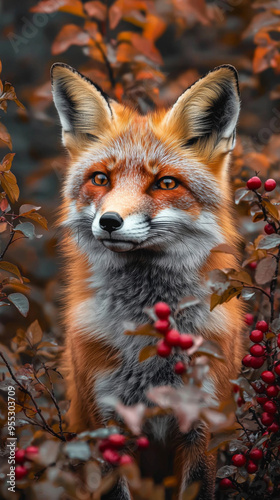 The watermark will not be included on Wall mural.: A fox is standing in a field of red berries