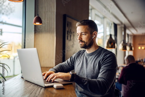 The watermark will not be included on Wall mural.: A freelancer is sitting at cafeteria and typing report on a laptop while working remotely -