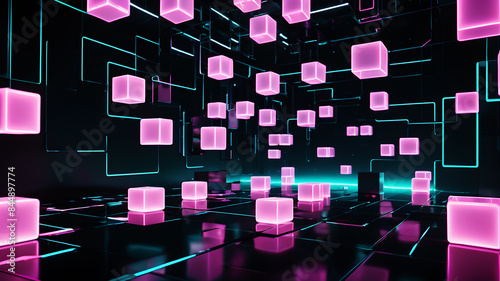 Wall mural a futuristic abstract background with glowing neon boxes floating in a dark space, with reflections