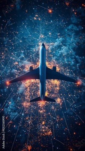 Wall mural a futuristic airplane soars above an illuminated cityscape with glowing lights and digital network p