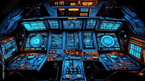 Wall mural : A futuristic control room with multiple screens and controls for advanced technology operations -