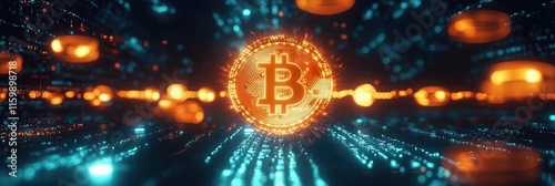 Wall mural : A futuristic digital background with glowing bitcoin coins floating in the center -