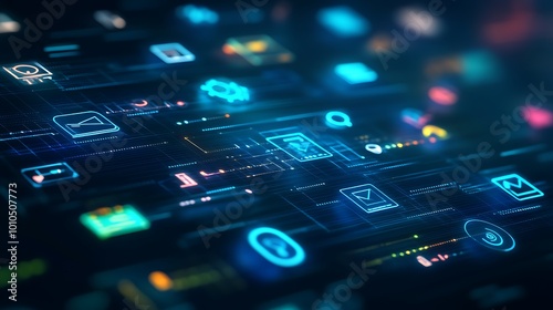The watermark will not be included on Wall mural.: A futuristic digital interface with colorful icons representing various applications, services, and