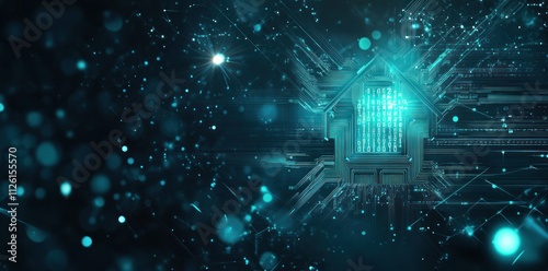 Wall mural a futuristic digital representation of a house with data streams and glowing elements.