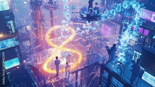 Wall mural a futuristic lab with glowing data streams and scientists exploring advanced technology.