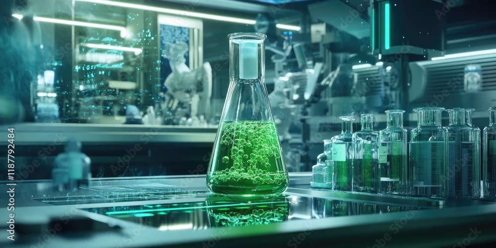 Wall mural a futuristic medical lab features holographic displays and advanced instruments, focusing on a flask