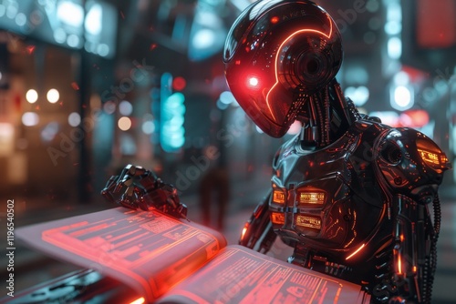 A futuristic robot with glowing red eyes reads a book with illuminated pages - ai generative - - Wall mural