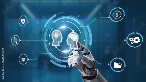 Wall mural a futuristic robotic hand interacts with a digital interface showcasing various artificial intellige - Wall murals Wall mural a futuristic robotic hand interacts with a digital interface showcasing various artificial intellige - Wall murals