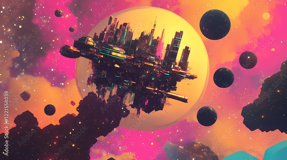 The watermark will not be included on Wall mural.: A futuristic space station orbiting a colorful planet surrounded by nebulae and distant celestial bo