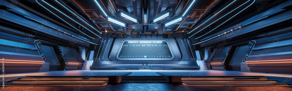 Wall mural a futuristic space with a large open area with a blue ceiling. the space is empty and has a futurist - Wall murals Wall mural a futuristic space with a large open area with a blue ceiling. the space is empty and has a futurist - Wall murals