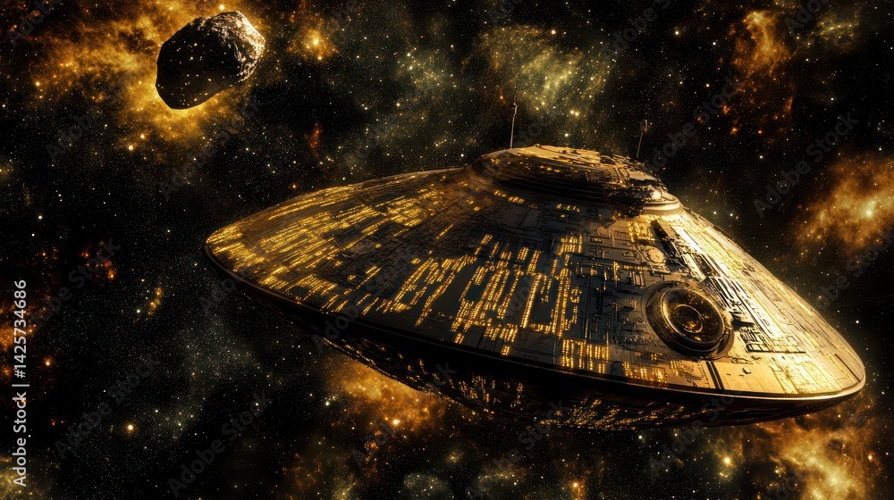 Wall mural a futuristic spacecraft floats in deep space with a celestial background - Wall murals Wall mural a futuristic spacecraft floats in deep space with a celestial background - Wall murals
