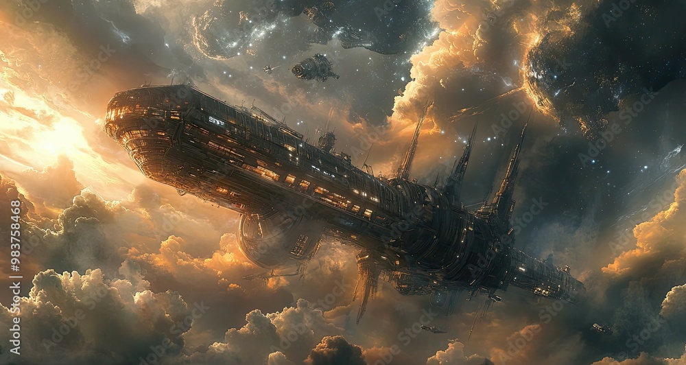 The watermark will not be included on Wall mural.: A futuristic spaceship flying through clouds in outer space