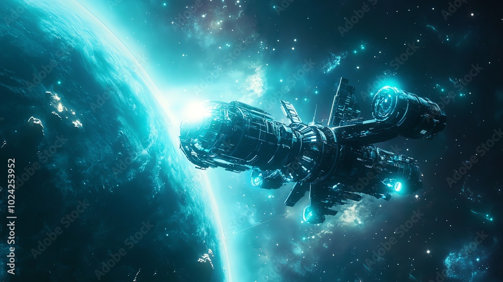 The watermark will not be included on Wall mural.: A futuristic spaceship soars past a planet in space -