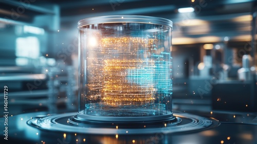 Wall mural : A futuristic technology device encased in a transparent cylinder glows with complex data and light i