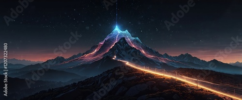 The watermark will not be included on Wall mural.: A futuristic vector design of a mountain with a glowing path and a wireframe flag, illustrating the