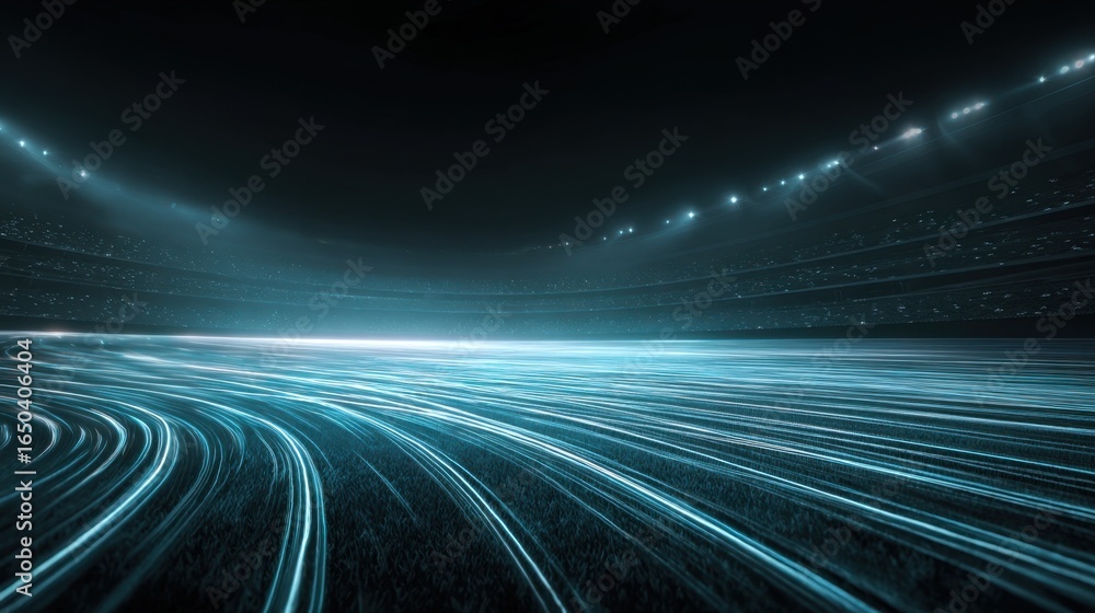 Wall mural a futuristic view of a stadium illuminated with blue light trails, creating a dynamic and abstract a
