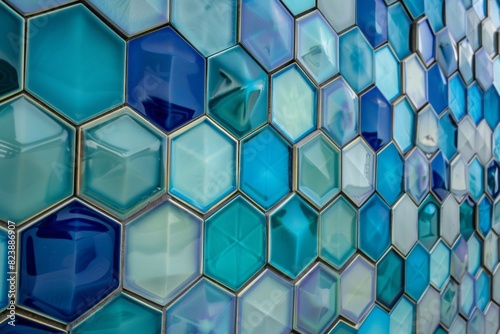 The watermark will not be included on Wall mural.: A geometric pattern of interlocking hexagons in various shades of blue and green, creating a modern
