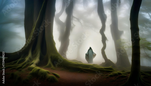 Wall mural a ghostly figure in a misty forest with twisted trees and dancing shadows