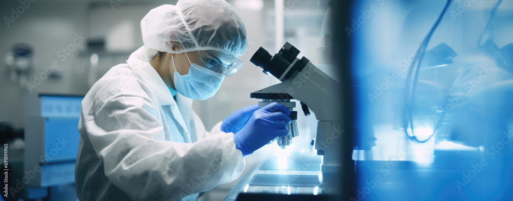 The watermark will not be included on Wall mural.: A girl scientist in a protective suit works with test tubes in a laboratory with a microscope