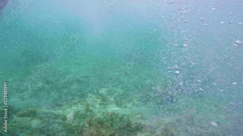 Wall mural a girl swimming with hawksbill sea turtle (eretmochelys imbricata), underwater 4k shot with air bubb - Wall murals Wall mural a girl swimming with hawksbill sea turtle (eretmochelys imbricata), underwater 4k shot with air bubb - Wall murals