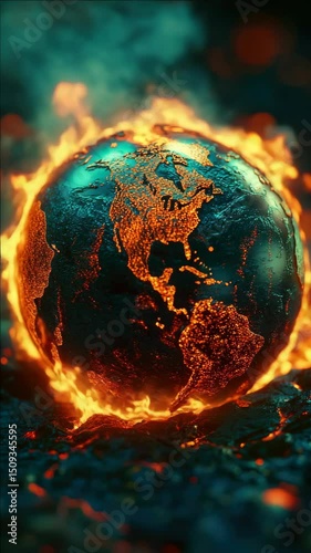 Wall mural a globe is on fire and surrounded by flames. the globe is surrounded by a blue and green color schem