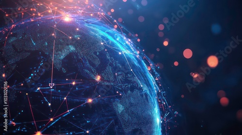 Wall mural a glowing blue and red globe with lines of code and connections symbolizing global digital network.