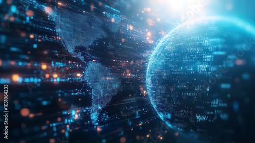 Wall mural : A glowing blue digital globe with data flowing around it, representing global connectivity and the d