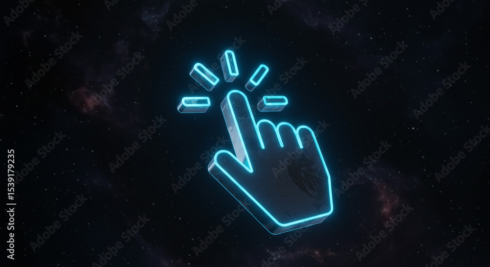 Wall mural a glowing blue hand pointer with radiating lines on a dark space background with stars and nebula